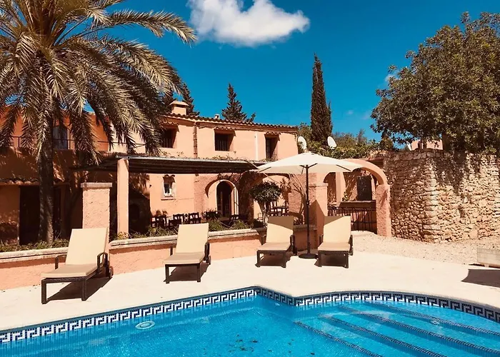 パティオの景色を望むFinca Can Jordiは,Crist reiから2.9キロです. このヴィラは,8室のベッドル-ムと8つのバスル-ムで構成されています.